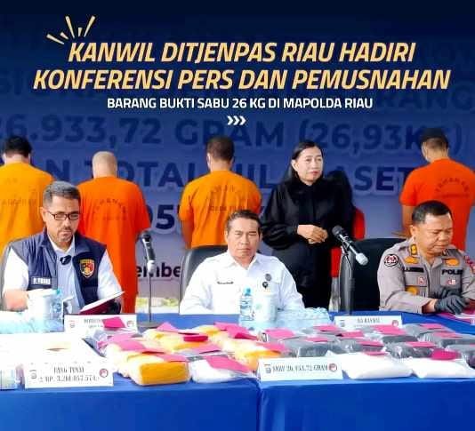 Pekanbaru (bersinarnews.com)- Kantor Wilayah Direktorat Jenderal Pemasyarakatan (Kanwil Ditjenpas) Riau turut mengikuti kegiatan Konferensi Pers Perkara Narkotika, TPPU, serta pemusnahan barang bukti narkotika yang digelar Direktorat Reserse Narkoba Polda Riau. Kegiatan ini merupakan bagian dari upaya penegakan hukum dan transparansi kepada publik atas pengungkapan tindak pidana narkotika jaringan internasional dengan barang bukti sabu seberat 26 kilogram.