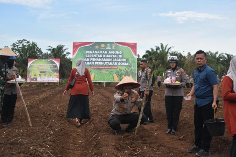 Kampar Utara (bersinarnews.com)- Komitmen Polri dalam mendukung program swasembada pangan nasional kembali dibuktikan dengan partisipasi aktif Kapolres Kampar AKBP Mihardi Mirwan, dalam kegiatan penanaman jagung serentak kuartal III tahun 2025. Rabu (9/7/2025), Kapolres Kampar hadir langsung di Dusun 2, Desa Kayu Aro, Kecamatan Kampar Utara, Kabupaten Kampar, untuk melakukan penanaman jagung di lahan perhutanan sosial dalam rangka mendukung swasembada pangan.