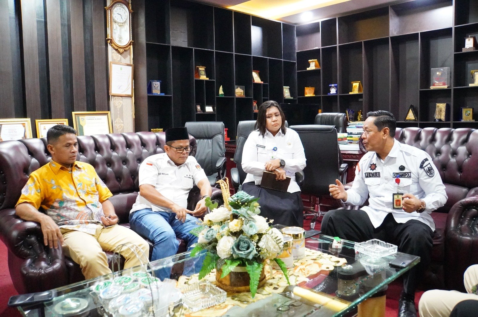 Rombongan KPU Provinsi Riau diterima langsung oleh Kepala Badan Kesbangpol Provinsi Riau Jenri Salmon Ginting, didampingi sejumlah pejabat di lingkungan Kesbangpol Provinsi Riau, antara lain Linda Marlina Siagian dan Tengku Rahadian.