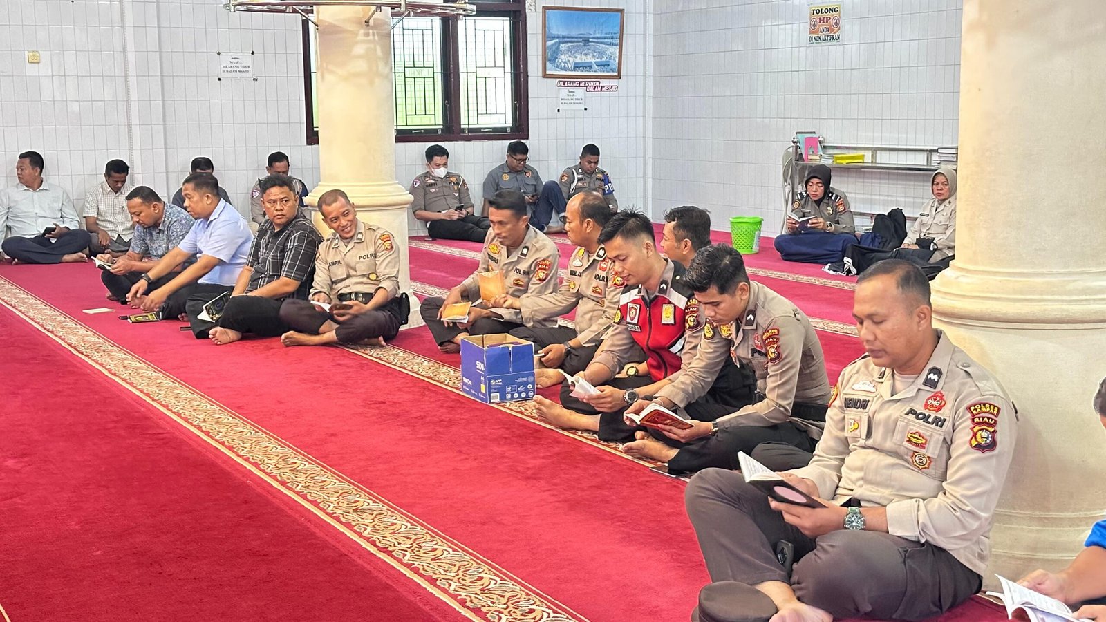 Personel muslim mengikuti Binrohtal yang diisi dengan yasinan dan tausiah agama. Kegiatan ini dilakukan secara zoom meeting dan juga secara langsung di Masjid Al-Ikhlas, samping Mako Polres Kampar, bersama penceramah Briptu Andri Agustian (Bamin Ur. Siptaka Setum Polda Jabar).