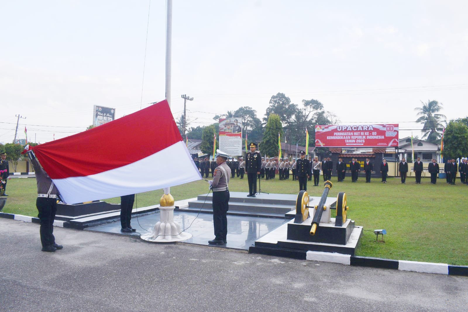 Upacara bendera HUT ke-80 Kemerdekaan RI di Polres Kampar dipimpin oleh Wakapolres Kampar, Kompol Andi Cakra Putra, yang mewakili Kapolres Kampar. Upacara ini diikuti oleh para Pejabat Utama Polres Kampar, beberapa Pleton Personel Polres Kampar, serta ASN Jajaran Polres Kampar.