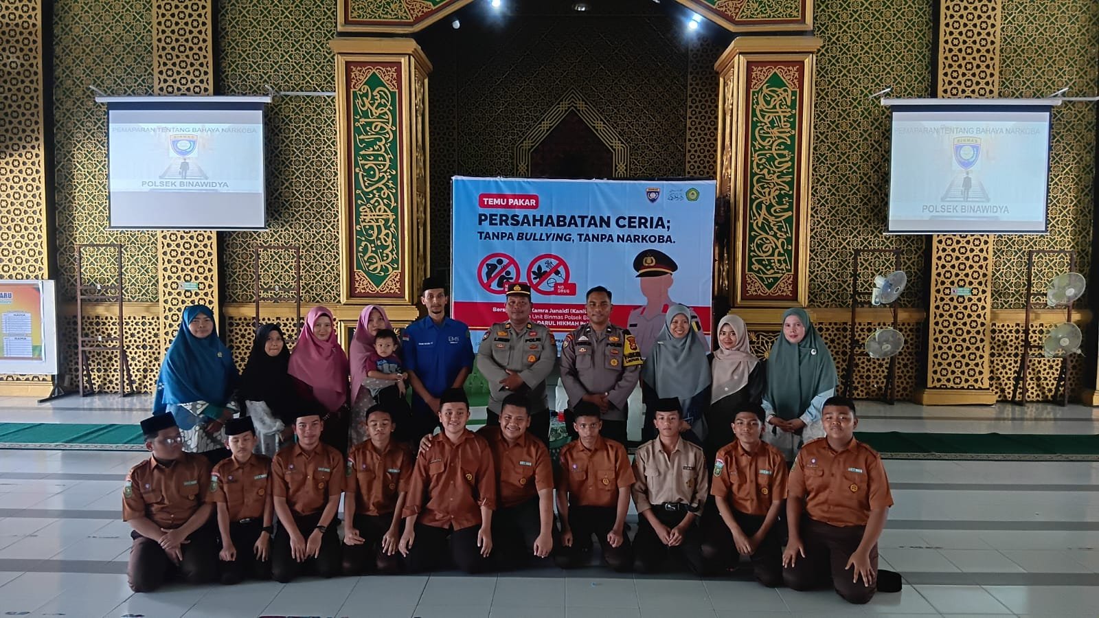 Bertempat di Mesjid Jami’ Dar El Hikmah Pekanbaru , Jl.Manyar sakti kel Sp baru kec Binawidya Pekanbaru Kapolsek Binawidya Kompol Ihut Manjalo Tua SH,MH memimpin kegiatan diwakili Iptu Kamra Junaedy/Kanit Binmas bersama bhabinkamtibmas Kel Sp baru Aipda Febri Rossalim SH Hadir memberi materi sosialisasi dan penyuluhan bertajuk Bahaya Narkoba, Kenakalan Remaja, dan stop Bullying . Apa yang disampaikan Bhabinkamtibmas Sp baru Aipda Febri sebagai pemateri, ratusan santriawan dan santriwati kelas 7 dan 8 pelajar MTs Darul hikmah Pekanbaru dengan antusias mendengar setiap paparan dan arahan yang disampaikan Aipda Febri dalam memberikan edukasi dan binbingan serta motivasi mengarahkan santri untuk berperilaku positif dan baik dalam pergaulan dilingkungan sehari hari.
